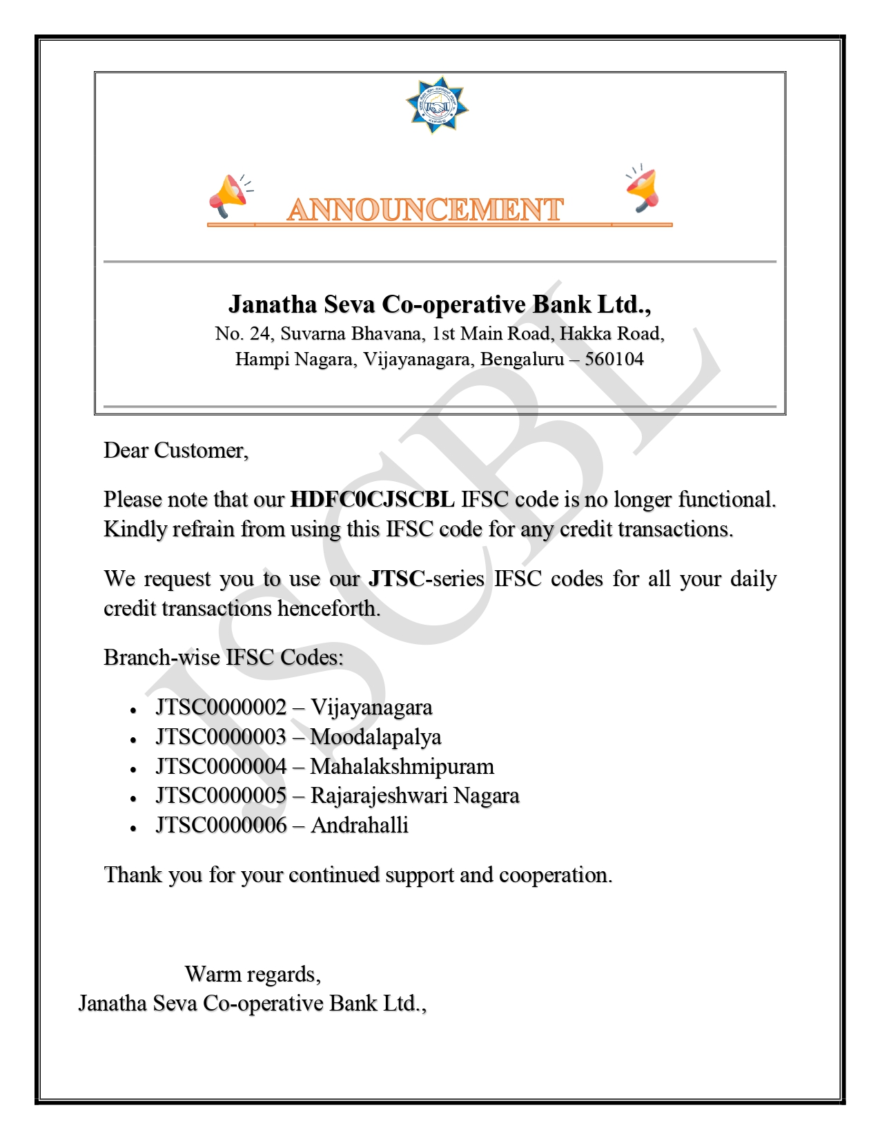 Janatha Seva Co-operative Bank Ltd., started its journey as Credit co-operative society in the year 1969. In the year 1996 the society graduated into Urban Co-operative Bank as Janatha Seva Co-operative Bank Limited and got RBI Licence on 17th October 1996 (RBI Licence No: UBD/KAN/1302P).